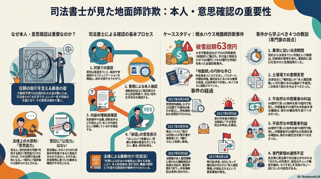 不動産売買の現場では、何億円という大金が目の前で動きます 。司法書士が「大丈夫です」と返答した瞬間に送金が実行されるため、その責任は非常に重く、高額な取引を安全に成立させ、誰も騙されることがないようにするために、本人確認と意思確認は絶対不可欠です 。