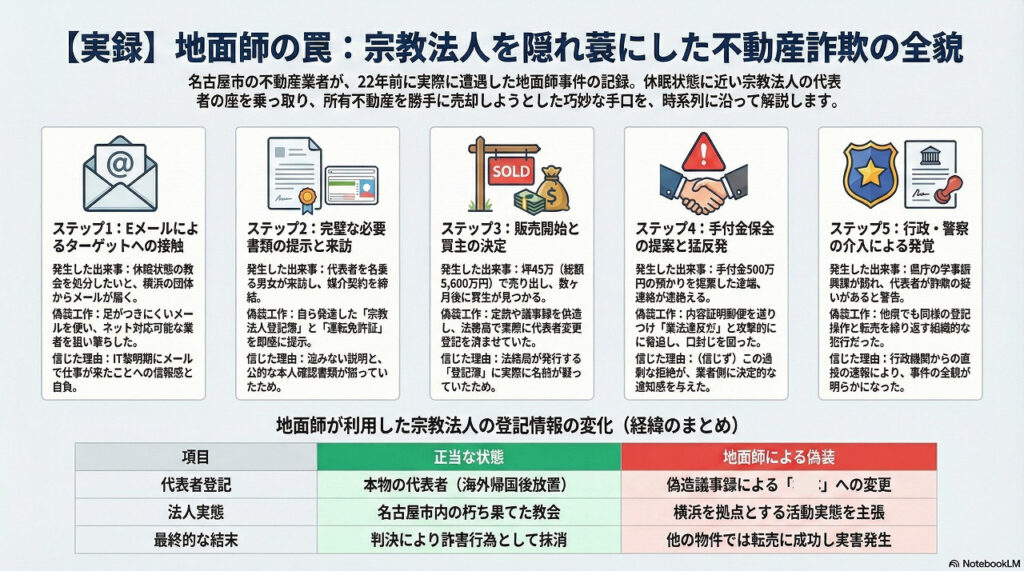 - 講師が過去に経験した、宗教法人を乗っ取った地面師による不動産詐欺未遂事件。