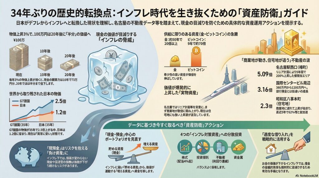 - 備える資産(インフレに強い): 株式、投資信託、不動産、貴金属(金など)、仮想通貨。借入金も貨幣価値下落で実質負担が軽くなるため含まれる。